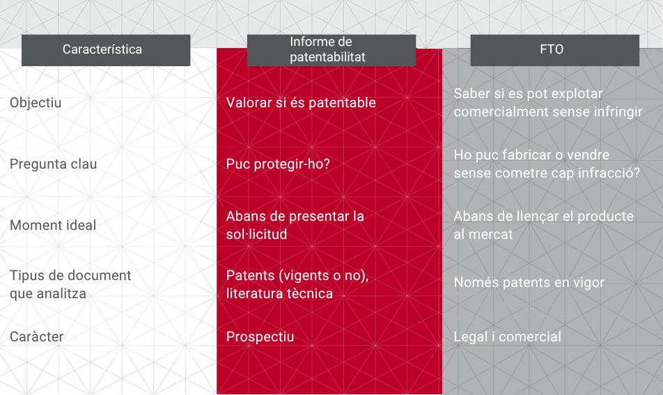 Com es pot veure, tots dos informes es basen en l’anàlisi de patents, però tenen finalitats completament diferents. L’un protegeix la innovació. L’altre redueix riscos legals. En molts casos, tots dos són necessaris per construir una estratègia de protecció sòlida i sense sorpreses.