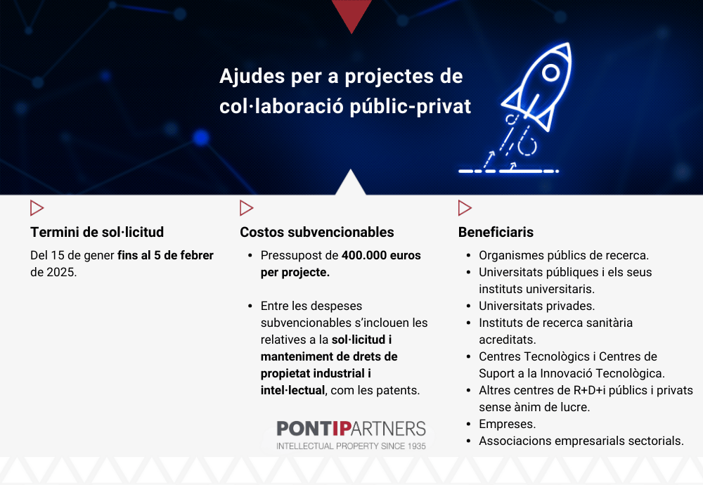Aquesta ajuda, que compta amb un import total de 320 milions d’euros, es podrà sol·licitar fins al 5 de febrer. Les ajudes econòmiques d’aquest programa es concedeixen mitjançant subvencions per a despeses d’organismes d’I+D+i, o bé amb préstecs per a empreses. Entre les moltes despeses vinculades a l’execució del projecte, s’inclouen les relatives a la sol·licitud i manteniment de drets de propietat industrial i intel·lectual, com patents o models d’utilitat.